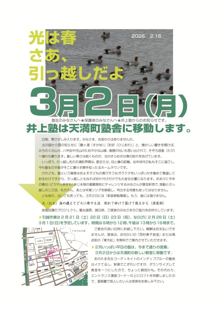 ホーム  >  お知らせ  >  【引越しだよ】井上塾は天満町塾舎に移動します。